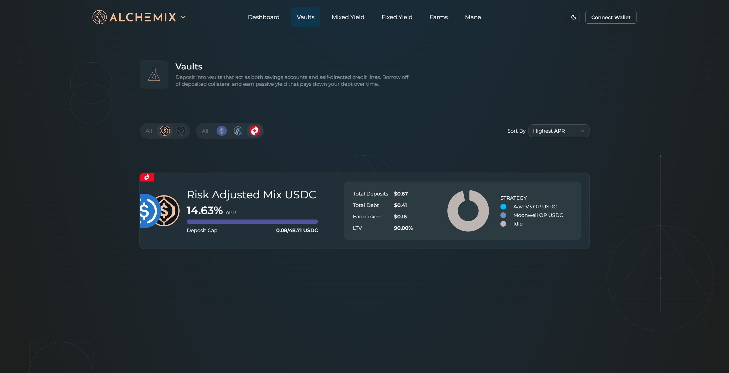 Use the asset filters (USDC or ETH) and chain filters to narrow the list. Sort by Highest APR to surface the best current rates. Click a vault card to open its detail page.