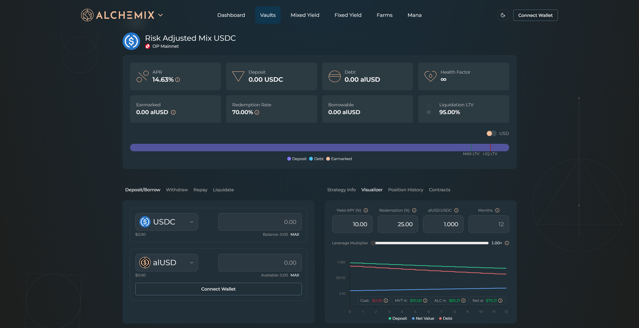 A vault deposit puts your ETH or USDC to work through the Mix-Yield Token (MYT). From there you can borrow alAssets against your deposit and let vault yield pay down the debt over time.