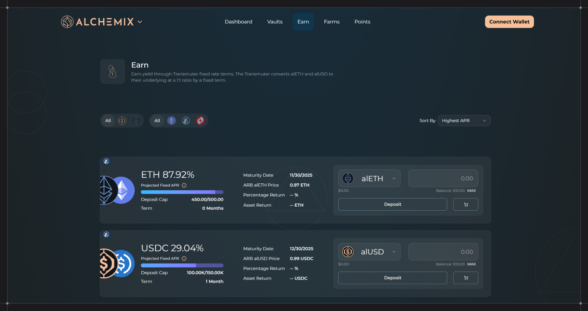 The Earn page lists every fixed-rate term available on your current network. By depositing alAssets, or letting the interface swap ETH or USDC into their alAsset form, you lock in a known return that settles on the termβs maturity date.