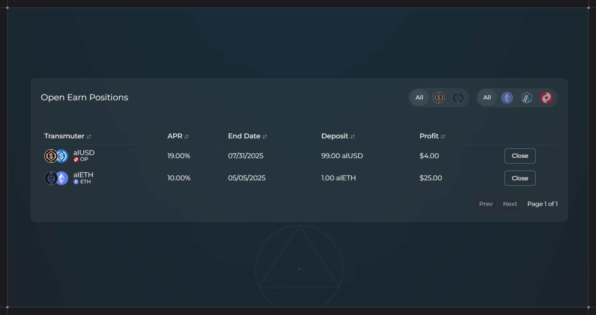 | Close (early) | Need funds before maturity | Receives a reduced amount, UI shows the penalty in advance. The penalty is a percentage set by the DAO, applying to untransmuted funds only. |